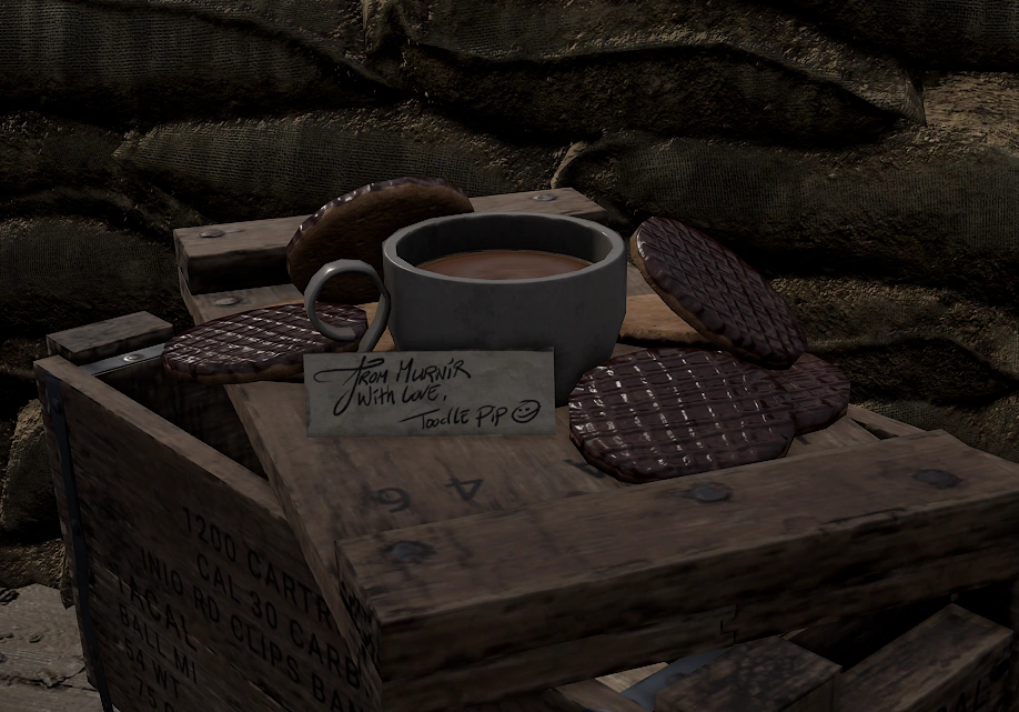 Tin of muffins on the table inside in the church. Reference to the EASY 506th PIR that run several HLL servers. |